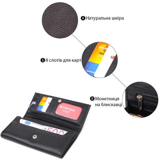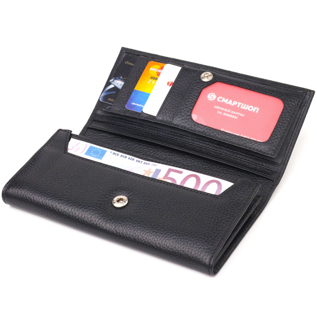 - гаманець упакований у фірмову коробочку. Багатофункціональний горизонтальний жіночий гаманець з натуральної зернистої шкіри в класичному чорному кольорі. Аксесуар має три великі кишені для купюр, три прилеглі кишені, вісім осередків для карток, три з них під сіточкою, монетницю на блискавці. Виріб закривається клапаном на кнопку. Відмінна ідея для подарунка, яка не залишить байдужою жодну жінку. ОПЛАТА та ДОСТАВКА : накладний платіж з передоплатою 200 грн.Терміни відправлення : 1-3 робочих днів