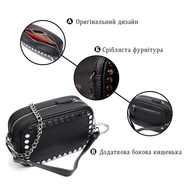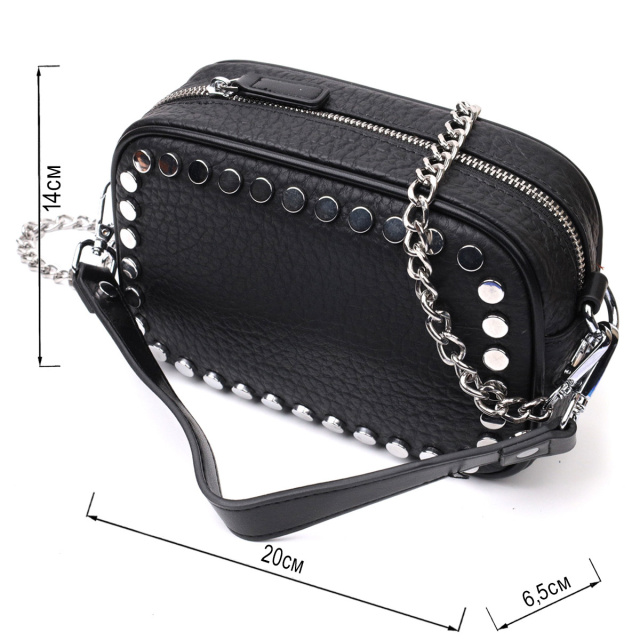 - знімний ремінець з ланцюжком для перенесення на плечі. Стильна сумка жіноча з натуральної крупнозернистої шкіри, на лицьовій стороні, по краю, декорована кнопками у вигляді прямокутника. Аксесуар складається з одного основного відділення, потайної кишені на блискавці, кишені відкритого типу та кишені на блискавці зовні. Носити сумку можна в руках, на плечі і через плече, для цього є ручка для перенесення в руках і знімний ремінець з ланцюжком для переносу не плечі. У виробі використано надійну фурнітуру срібного кольору. Шкіряна сумка – найкращий подарунок для будь-якої дівчини. ОПЛАТА та ДОСТАВКА : накладний платіж з передоплатою 200 грн.Терміни відправлення : 1-3 робочих днів