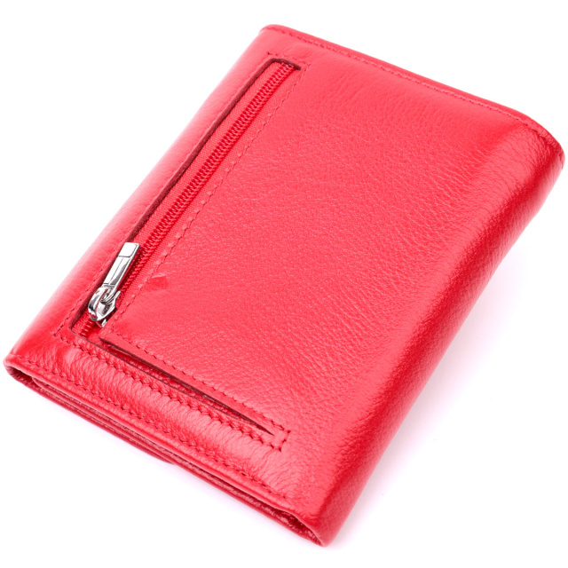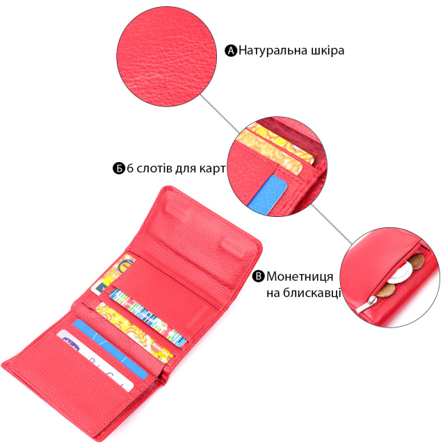 - закривається клапаном на магніти. Жіночий яскравий гаманець середнього розміру із натуральної шкіри найвищої якості. Аксесуар складається з одного місткого відділення для купюр, кишені на блискавці через всю довжину, шести осередків для карт, чотирьох прихованих кишень, кишеньки під плівкою та зовнішньої кишені на блискавці, що чудово прослужить для монет. Зовні виріб прошитий рівним рядком по краю і прикрашений металевим логотипом компанії виробника, який розміщений на клапані посередині. Портмоне доповнено надійною фурнітурою та міцною підкладкою. Укомплектований гаманець у фірмову картонну коробку білого кольору. Виріб стане ідеальним подарунком для дівчини будь-якого віку.