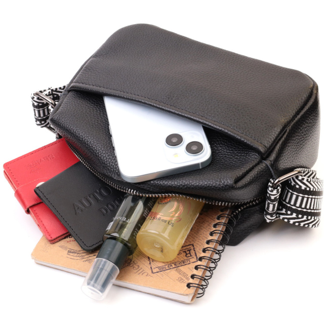 - не знімний текстильний ремінь. Жіноча сумка у класичному чорному кольорі на всі випадки з натуральної якісної шкіри. Аксесуар складається з основного відділення, яке закривається на блискавку, а також двох кишень зовні на лицьовій та тильній стороні. Носити сумку можна в руці, під рукою, на плечі і через плече, для цього є текстильний ремінь, що не знімається. В аксесуарі використано якісну фурнітуру кольору темного срібла. У нашому магазині Ви зможете придбати якісний шкіряний аксесуар, який завжди порадує жінку будь-якого віку. ОПЛАТА та ДОСТАВКА : накладний платіж з передоплатою 200 грн.Терміни відправлення : 1-3 робочих днів