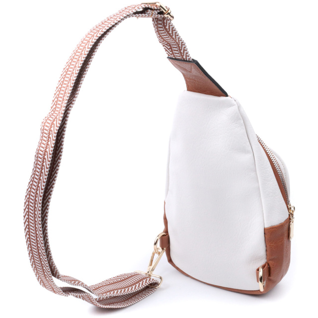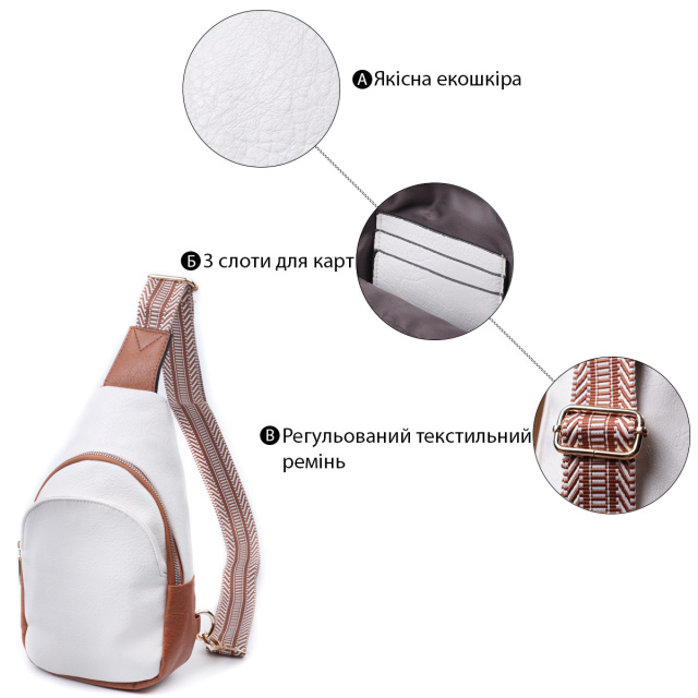- текстильний плечовий регульований ремінець. Жіноча сумка через плече з якісної екошкіри у красивому білому кольорі з коричневими вставками. Дана модель складається з одного основного відділення, яке закривається на блискавку і в якому знаходиться потайна кишеня на блискавці і три осередки для кредитних карток усередині, а також однієї кишені зовні, на лицьовій стороні. Акцентом даної моделі є зручний регульований плечовий ремінець у етнічному стилі, що дуже модно вже кілька сезонів. Екошкіра – високоякісна альтернатива натуральному матеріалу, яка дуже стійка до тертя, до низьких температур, відмінно носиться на відміну від інших штучних матеріалів, а також має гіпоалергенний склад на відміну від натуральної шкіри. Практичний варіант сумки, який порадує будь-яку дівчину, тому що всі речі під рукою та в безпеці. ОПЛАТА та ДОСТАВКА : накладний платіж з передоплатою 200 грн.Терміни відправлення : 1-3 робочих днів