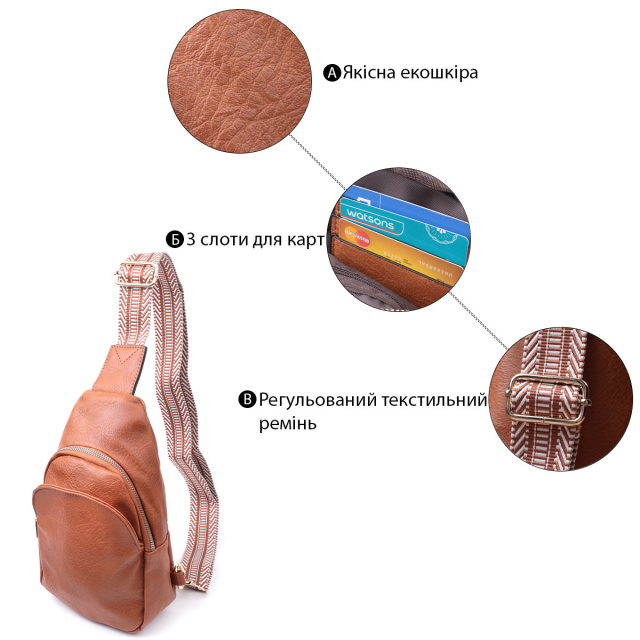 - текстильний плечовий регульований ремінець. Жіноча сумка через плече із якісної екошкіри в цікавому рудому кольорі. Дана модель складається з одного основного відділення, яке закривається на блискавку і в якому знаходиться потайна кишеня на блискавці і три осередки для кредитних карток усередині, а також однієї кишені зовні, на лицьовій стороні. Акцентом даної моделі є зручний регульований плечовий ремінець у етнічному стилі, що дуже модно вже кілька сезонів. Екошкіра – високоякісна альтернатива натуральному матеріалу, яка дуже стійка до тертя, до низьких температур, відмінно носиться на відміну від інших штучних матеріалів, а також має гіпоалергенний склад на відміну від натуральної шкіри. Практичний варіант сумки, який порадує будь-яку дівчину, тому що всі речі під рукою та в безпеці. ОПЛАТА та ДОСТАВКА : накладний платіж з передоплатою 200 грн.Терміни відправлення : 1-3 робочих днів