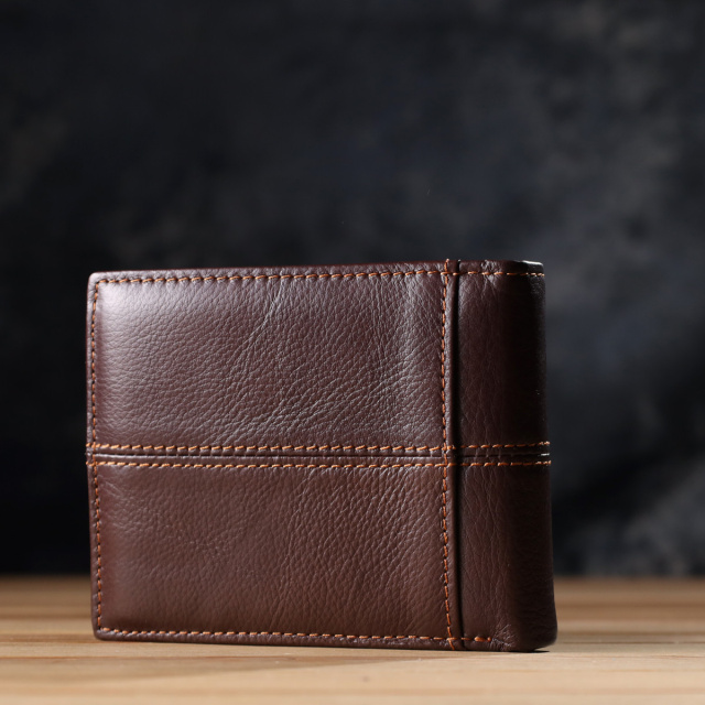 - без застібки. Якісний чоловічий гаманець, виготовлений з натуральної шкіри преміальної якості. Аксесуар акуратно прошитий надміцною коричневою ниткою, що надає виробу додаткову міцність і підкреслює його елегантний зовнішній вигляд. Гаманець приємний на дотик, з продуманою до дрібниць внутрішньою організацією. Компактний та зручний, він легко поміщається в кишеню чи сумку, забезпечуючи швидкий доступ до всіх необхідних речей. Модель складається навпіл і не має застібки, що робить використання ще більш зручним та практичним. Всередині гармонійно поєднуються елементи з натуральної шкіри та щільного текстилю, що збільшує термін служби аксесуара. Гаманець поставляється в білому текстильному чохлі, що робить його відмінним варіантом для подарунка. ОПЛАТА та ДОСТАВКА : накладний платіж з передоплатою 200 грн.Терміни відправлення : 1-3 робочих днів