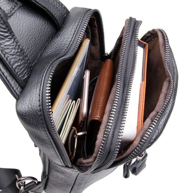 Розмір (ШхВхГ, см): 17х25х6. Багатофункціональна сумка, яка може використовуватися як чоловіками, так і жінками. Аксесуар виконаний з натуральної високоякісної шкіри приємноюї на дотик. Колір фурнітури: темне срібло. На лицевій стороні знаходиться відразу 3 кишені: 2 на блискавках і одина на магнітній кнопці. На задній зовнішній стороні знаходиться відділення на блискавці. Особливості: