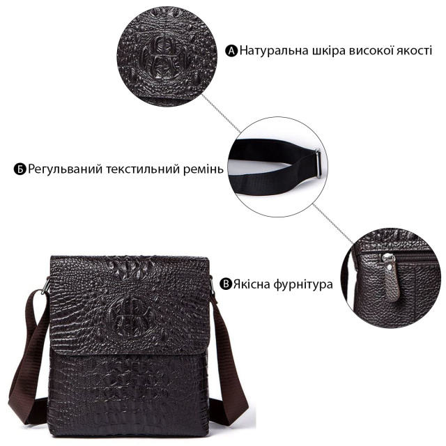 - ремінець на плече текстильний (незйомний); Солідна чоловіча вертикальна сумка високої якості. Аксесуар підходить на роботу і на зустрічі. Сумка зручно носиться на плечі. Аксесуар має тиснення під шкіру крокодила і носиться досить довго і не примхливий у догляді. Модель під шкіру рептилії оцінить кожен чоловік. Буде чудовим подарунком. Сумка упакована в тканинний чохол, що захищає її від пилу і зносу. ОПЛАТА та ДОСТАВКА : накладний платіж з передоплатою 200 грн.Терміни відправлення : 1-3 робочих днів