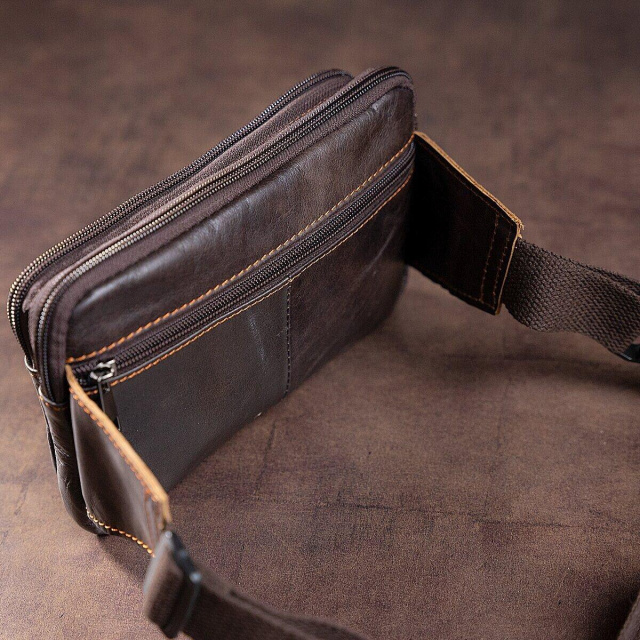 - ремінець на пояс; Сумка на пояс з простим, класичним дизайном. Поясні сумки користуються величезною популярністю серед чоловіків. З такою сумкою все найважливіше буде у вас завжди під рукою. А вкрасти сумку з пояса буде набагато складніше. Тому з такою бананкою ви будете почувати себе безпечніше. Також, з нею зручно їздити в транспорті або брати її на далекі поїздки. Хороший варіант малогабаритний, але при цьому досить місткий. Вам буде легко з такої сумки дістати документи або гроші при необхідності. Модель прошита рудою ниткою і доповнена фурнітурою сріблястого кольору. Буде добре виглядати в якості подарунка для близької людини.