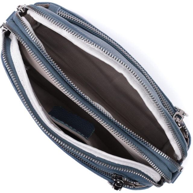 - знімний текстильний ремінь. Практична жіноча сумка на всі випадки із натуральної шкіри флотар, яка має зернисту фактуру. У виробі використано шкіру синього кольору. Аксесуар складається з двох відділень, які закриваються на блискавці, потайної кишені на блискавці та кишені відкритого типу, а також двох кишень зовні на лицьовій та тильній стороні. Носити сумку можна в руці, під рукою, на плечі і через плече, для цього є текстильний ремінь, що знімається. В аксесуарі використано якісну фурнітуру кольору темного срібла. Відмінний варіант для подарунка близьким та дорогим дівчатам та жінкам. ОПЛАТА та ДОСТАВКА : накладний платіж з передоплатою 200 грн.Терміни відправлення : 1-3 робочих днів