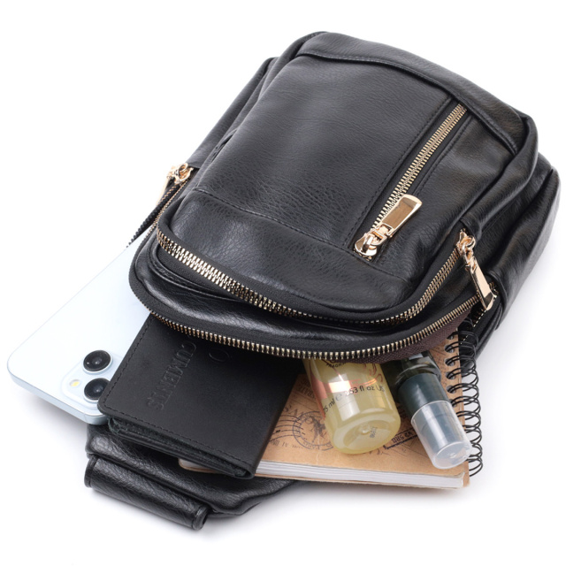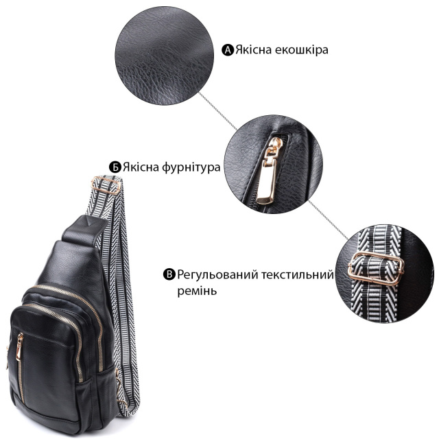 - текстильний плечовий регульований ремінець. Топова слінг сумка з якісної екошкіри, в класичному чорному кольорі. Екошкіра – високоякісна альтернатива натуральному матеріалу, яка дуже стійка до тертя, до низьких температур, відмінно носиться на відміну від інших штучних матеріалів, а також має гіпоалергенний склад на відміну від натуральної шкіри. Дана модель складається з одного основного відділення, яке закривається на блискавку і в якому знаходиться потайна кишеня, а також трьох кишень зовні та одного отвору для кабелю або навушників, що дуже зручно в сучасному світі. Основною фішкою моделі є зручний регульований плечовий ремінець із стильним візерунком. Відмінний варіант сумки на кожен день та у будь-який сезон. ОПЛАТА та ДОСТАВКА : накладний платіж з передоплатою 200 грн.Терміни відправлення : 1-3 робочих днів