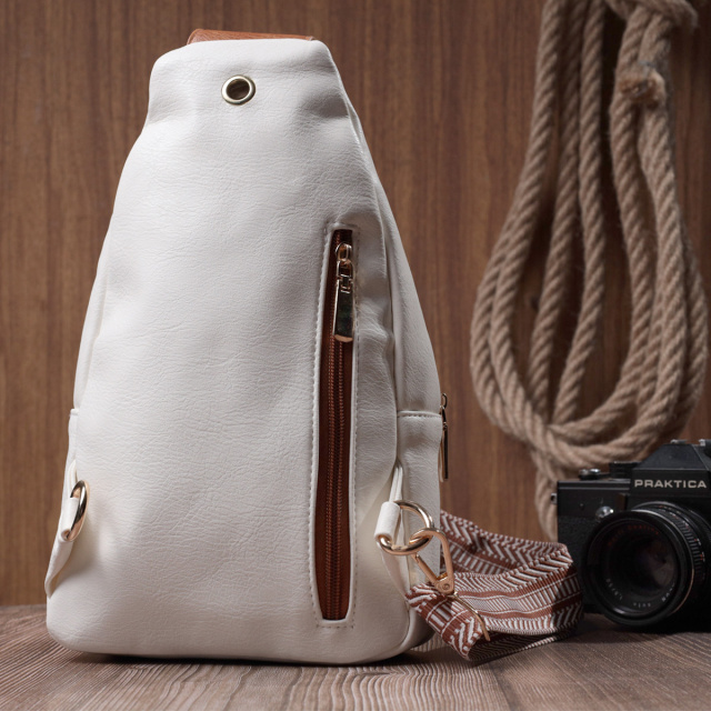 - текстильний плечовий регульований ремінець. Пропонуємо до Вашої уваги зручну слінг сумку з екошкіри в поєднанні білого та коричневого кольору. Дана модель складається з одного основного відділення, яке закривається на блискавку і в якому знаходиться кишеня на блискавці та кишеня відкритого типу всередині, а також чотирьох кишень зовні та одного отвору для кабелю або навушників, що дуже зручно в сучасному світі. Основною фішкою моделі є зручний регульований плечовий ремінець у етнічному стилі, що дуже модно вже кілька сезонів. Екошкіра – високоякісна альтернатива натуральному матеріалу, яка дуже стійка до тертя, до низьких температур, відмінно носиться на відміну від інших штучних матеріалів, а також має гіпоалергенний склад на відміну від натуральної шкіри. ОПЛАТА та ДОСТАВКА : накладний платіж з передоплатою 200 грн.Терміни відправлення : 1-3 робочих днів