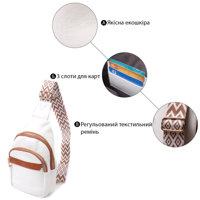 - текстильний плечовий регульований ремінець. Зручна слінг сумка для жінок з гладкої екошкіри. Дана модель складається з одного основного відділення, яке закривається на блискавку і в якому знаходиться кишеня на блискавці і три кишені для кредитних карток усередині, а також трьох кишень зовні та одного отвору для кабелю або навушників, що дуже зручно в сучасному світі. Акцентом даної моделі є зручний регульований плечовий ремінець у етнічному стилі, що дуже модно вже кілька сезонів. Екошкіра - високоякісна альтернатива натуральному матеріалу, яка дуже стійка до тертя, до низьких температур, відмінно носиться на відміну від інших штучних матеріалів, а також має гіпоалергенний склад на відміну від натуральної шкіри. ОПЛАТА та ДОСТАВКА : накладний платіж з передоплатою 200 грн.Терміни відправлення : 1-3 робочих днів