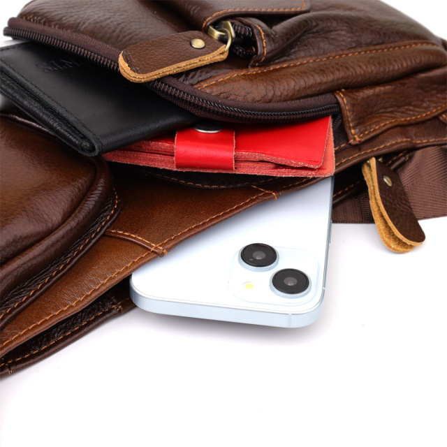 - регульований текстильний ремінь. Класична та практична коричнева чоловіча шкіряна сумка через плече – ідеальний аксесуар для сучасних чоловіків, які цінують комфорт та стиль. Виготовлена з натуральної шкіри глибокого коричневого відтінку, сумка відрізняється міцністю та елегантністю, яка чудово поєднується з діловим та повсякденним гардеробом. Модель оснащена одним основним відділенням, яке закривається на блискавку, де зручно розмістяться всі необхідні речі. На лицьовій стороні розташовані три кишені на блискавці, що забезпечують швидкий доступ до дрібних предметів, таких як ключі, телефон або гаманець. На звороті передбачена вертикальна кишеня на блискавці — додатковий простір для зберігання важливих аксесуарів. Фурнітура кольору латунь додає сумці мужності та вінтажного шарму, підкреслюючи високу якість та стиль виробу. Регульований текстильний ремінь гарантує комфортну посадку, дозволяючи адаптувати сумку під будь-яке зростання і спосіб носіння через плече або на плечі. Ця коричнева шкіряна сумка через плече стане вашим надійним супутником у місті, на роботі та у подорожах, поєднуючи в собі практичність та елегантність. ОПЛАТА та ДОСТАВКА : накладний платіж з передоплатою 200 грн.Терміни відправлення : 1-3 робочих днів