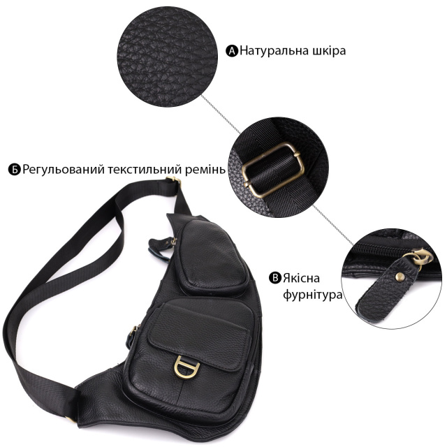 - регульований текстильний ремінь. Стильна та функціональна напівкругла чоловіча шкіряна сумка через плече – ідеальний вибір для сучасних чоловіків, які цінують зручність та продуманий дизайн. Виготовлена з натуральної шкіри високої якості, сумка поєднує довговічність, елегантність і практичність. Модель оснащена одним основним відділенням, яке закривається на блискавку, забезпечуючи надійний захист речей. На лицьовій стороні розташовані дві кишені на блискавці для швидкого доступу до дрібних предметів, а також одна накладна кишеня з клапаном на магніт, яка ідеально підходить для зберігання аксесуарів, що потребують додаткового захисту. На тильній стороні знаходиться вертикальна кишеня на блискавці — зручне місце для документів чи інших важливих предметів. Фурнітура кольору латунь надає сумці стильного та мужнього акценту, підкреслюючи високу якість виробу. Регульований текстильний ремінь забезпечує комфортну посадку та дозволяє носити сумку через плече або на плечі, адаптуючи її під ваш стиль та спосіб життя. Ця напівкругла шкіряна сумка через плече – надійний та елегантний аксесуар для повсякденного використання та ділових зустрічей. ОПЛАТА та ДОСТАВКА : накладний платіж з передоплатою 200 грн.Терміни відправлення : 1-3 робочих днів