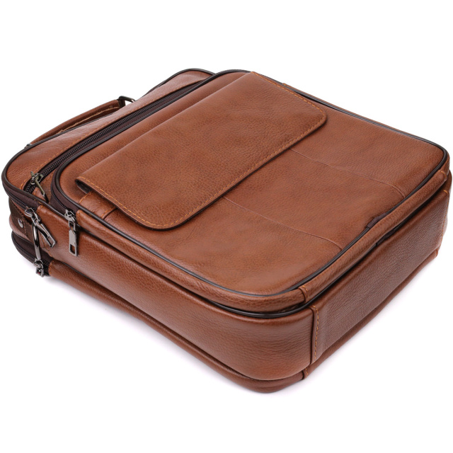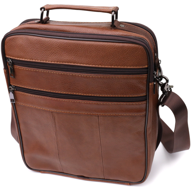 - Знімний регульований текстильний ремінець на плече. Практична чоловіча шкіряна сумка із зернистої натуральної шкіри поєднує в собі міцність, функціональність та стильний дизайн. Вона стане ідеальним аксесуаром для тих, хто цінує зручність та організованість у повсякденному житті. Сумка оснащена двома основними відділеннями на блискавках, що дозволяє раціонально розподілити речі та швидко знаходити необхідне. В одному з відділень знаходиться потайна кишеня на блискавці на задній стінці для надійного зберігання цінних дрібниць. На лицьовій стороні розташовані три кишені: накладна кишенька на блискавці, горизонтальна вбудована кишеня на блискавці та горизонтальна кишеня під клапаном на магніті - всі вони забезпечують зручний доступ до найпотрібніших предметів. Тильна сторона сумки обладнана двома кишенями на блискавках, що додає додатковий простір для зберігання та допомагає підтримувати порядок. Фурнітура срібного кольору надає моделі сучасного та акуратного вигляду. Для зручності перенесення передбачена шкіряна ручка із зернистої шкіри, а також регульований знімний текстильний ремінець, що дозволяє носити сумку на плечі. Ця шкіряна сумка – відмінний вибір для тих, хто шукає поєднання практичності, якості та елегантності в одному аксесуарі. ОПЛАТА та ДОСТАВКА : накладний платіж з передоплатою 200 грн.Терміни відправлення : 1-3 робочих днів