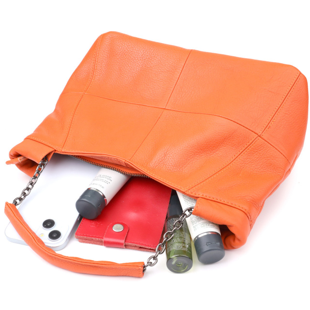 - знімний шкіряний ремінець. Жіноча шкіряна сумка помаранчевого кольору – виразний акцент для стильних та сміливих образів. Ця сумка виконана з натуральної шкіри яскравого помаранчевого відтінку, який миттєво привертає увагу та додає енергії у повсякденний гардероб. Такий аксесуар ідеально підійде тим, хто любить виділятися, але цінує функціональність і комфорт. Усередині сумки - просторе основне відділення, що закривається на блискавку, що забезпечує надійний захист вмісту. Організація внутрішнього простору продумана до дрібниць: потайна кишеня на блискавці, кишеня-перегородка на блискавці і дві відкриті кишені дозволяють зручно розмістити все необхідне — від телефону до документів та косметики. На тильній стороні сумки розташована зовнішня кишеня на блискавці, що особливо зручно для предметів, до яких потрібний швидкий доступ. Модель оснащена одним шкіряним знімним ремінцем, який регулюється по довжині, дозволяючи носити сумку через плече або на плечі — в залежності від образу і переваг. Фурнітура в сріблястому кольорі елегантно контрастує із соковитим помаранчевим кольором шкіри, підкреслюючи сучасний та свіжий стиль аксесуара. Ця помаранчева шкіряна сумка від бренду - ідеальний вибір для жінок, які люблять яскраві рішення без компромісів у зручності та якості. ОПЛАТА та ДОСТАВКА : накладний платіж з передоплатою 200 грн.Терміни відправлення : 1-3 робочих днів