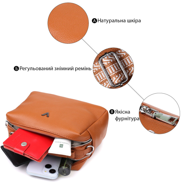 - знімний текстильний ремінь. Елегантна жіноча модель виконана з натуральної шкіри в насиченому рудому відтінку, який додає теплоти образу і чудово поєднується з класичними і повсякденними луками. Колір виглядає жваво та ефектно, підкреслюючи натуральну фактуру шкіри. Сумка має два основні відділення на блискавці, що забезпечує зручну організацію простору. Усередині розташована потайна кишеня на блискавці - відмінне рішення для зберігання дрібниць та необхідних предметів. На дні виробу - металеві ніжки, що захищають сумку від потертостей та забруднень під час повсякденного використання. Стильна фурнітура у кольорі срібла робить акцент на витонченості та сучасному виконанні. Модель доповнена знімним текстильним ременем, який регулюється по довжині і дозволяє носити сумку через плече або плече. Сумка у рудому кольорі стане виразним акцентом у будь-якому образі та надійним супутником на кожен день. ОПЛАТА та ДОСТАВКА : накладний платіж з передоплатою 200 грн.Терміни відправлення : 1-3 робочих днів