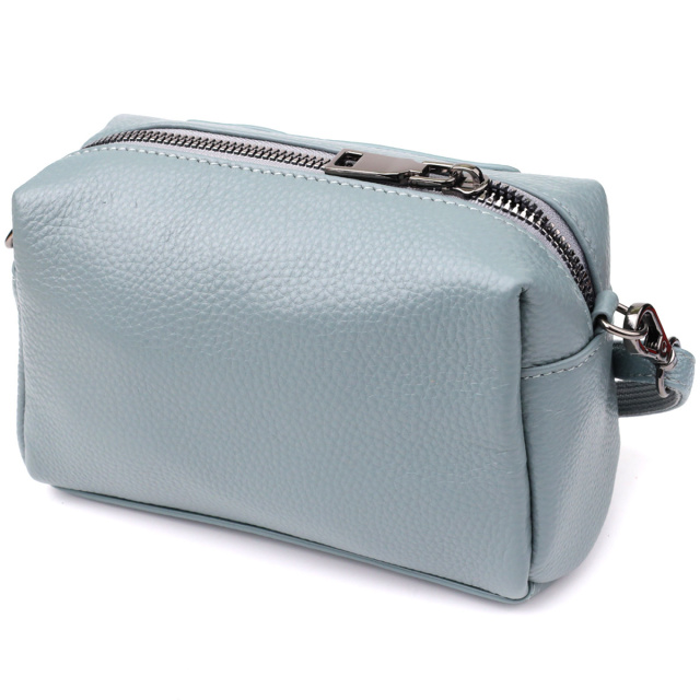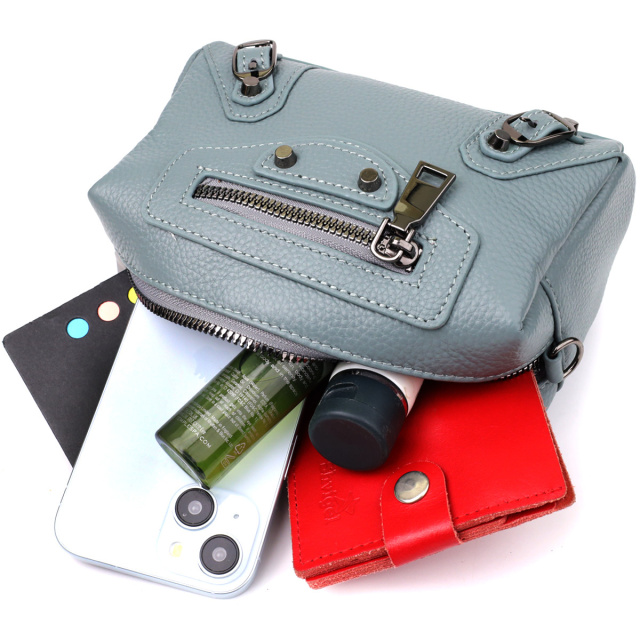 - знімний ремінь. Невелика жіноча шкіряна сумка у блакитному кольорі з декоративною фурнітурою – свіжий акцент із характером. Ця компактна модель виконана з натуральної шкіри в ніжному блакитному відтінку, який надає образу легкість та витонченість. Основна увага в дизайні приділена декоративним деталям: металеві заклепки, ремінці та фігурний рядок на лицьовій стороні додають стилю динаміки та оригінальності. Сумка має зовнішню кишеню на блискавці з декоративним оформленням, а також головне відділення на блискавці. Усередині — потайна кишеня на блискавці та кишеня відкритого типу для необхідних дрібниць. Фурнітура у кольорі темного срібла ефектно контрастує з блакитним тлом, наголошуючи на сучасності моделі. Завдяки знімному регульованому ременю сумку зручно носити через плече або на плечі. Цей аксесуар - ідеальне рішення для тих, хто шукає не просто сумку, а стильний акцент, що підкреслює індивідуальність та смак. Блакитна шкіряна сумка з декором стане гармонійним завершенням як повсякденного, так і витонченішого образу. ОПЛАТА та ДОСТАВКА : накладний платіж з передоплатою 200 грн.Терміни відправлення : 1-3 робочих днів