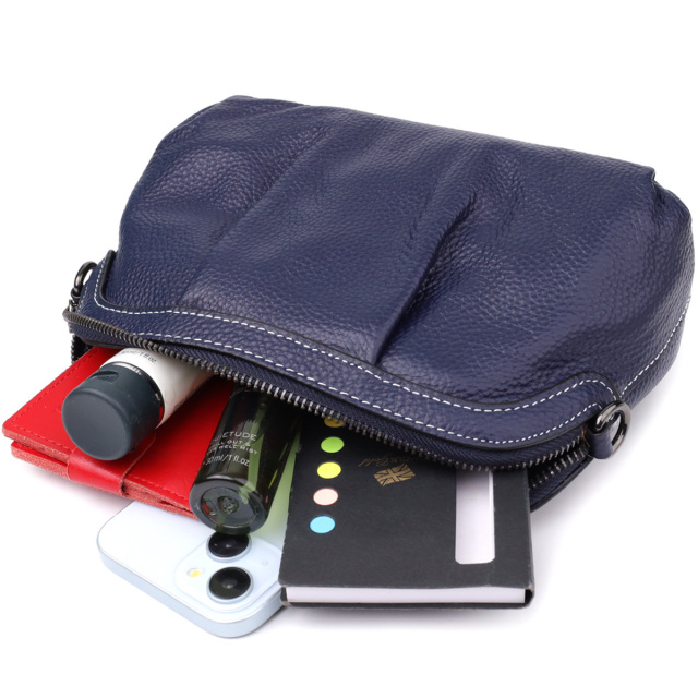 - знімні 2 шкіряні ремінці. Елегантна синя шкіряна сумка з драпіруванням - це гармонійне поєднання виразного дизайну, практичності та бездоганного стилю. М'які декоративні складки на лицьовій стороні надають виробу обсягу та динаміки, підкреслюючи текстуру натуральної шкіри та додаючи нотку вишуканості. Глибокий синій колір надає образу свіжості та впевненості, залишаючись при цьому універсальним і легко поєднується з різним одягом. Сумка має одне основне відділення, що надійно закривається на блискавку. Внутрішній простір продумано до дрібниць: потайна кишеня на блискавці, відкрита кишеня та кишеня-перегородка з блискавкою дозволяють зручно розмістити все необхідне та підтримувати порядок у сумці. Краї виробу прикрашені акуратним білим рядком, який стильно виділяється на тлі насиченого синього відтінку. Фурнітура кольору темного срібла додає благородного блиску, наголошуючи на сучасному характері моделі. У комплект входять два знімні шкіряні ремінці - сумку можна носити в руці, на плечі або через плече, адаптуючи її під будь-який стиль і спосіб життя. Синя шкіряна сумка з драпіруванням - це універсальний і ефектний аксесуар, який підкреслить вашу індивідуальність і доповнить як повсякденний, так і ошатний гардероб. ОПЛАТА та ДОСТАВКА : накладний платіж з передоплатою 200 грн.Терміни відправлення : 1-3 робочих днів