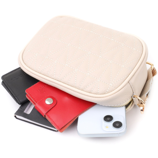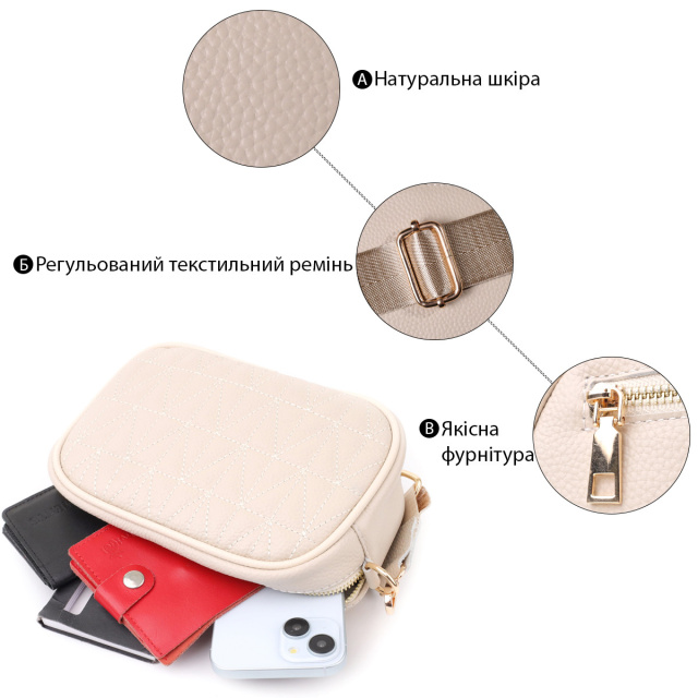 - колір фурнітури під жовте золото. Сумка жіноча в ніжному білому кольорі з натуральної шкіри стане елегантним і вишуканим акцентом вашого образу. М'яка, але щільна шкіра приємна на дотик і підкреслює високу якість виробу. Компактна чітка форма робить модель акуратною та зручною, а стібка на лицьовій стороні додає витонченого дизайнерського характеру. Сумка закривається на блискавку, всередині розташоване основне відділення з кишенею на блискавці та відкритою кишенею для дрібниць, а на тильній стороні є зовнішня кишеня на блискавці для швидкого доступу до потрібних речей. Знімний текстильний ремінь, що регулюється, забезпечує комфорт при носінні, а фурнітура під жовте золото гармонійно відтіняє світлий білий тон шкіри. Ця сумка стане універсальним аксесуаром для повсякденних виходів та особливих випадків, підкреслюючи витончений смак та любов до якісних матеріалів. ОПЛАТА та ДОСТАВКА : накладний платіж з передоплатою 200 грн.Терміни відправлення : 1-3 робочих днів