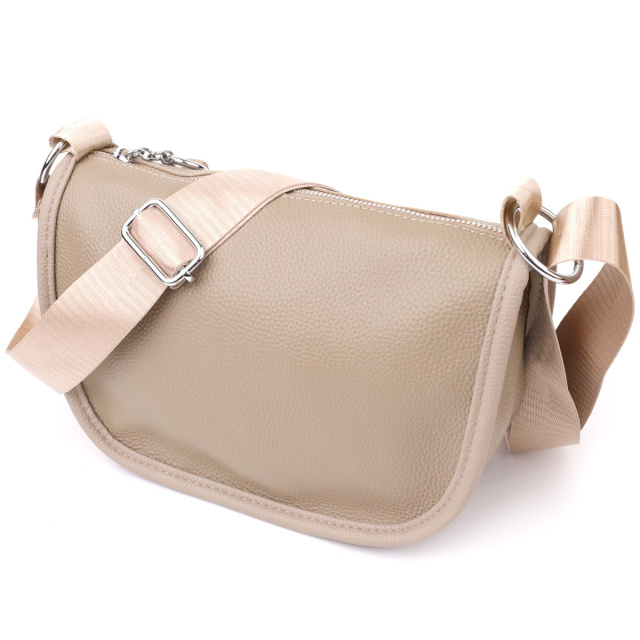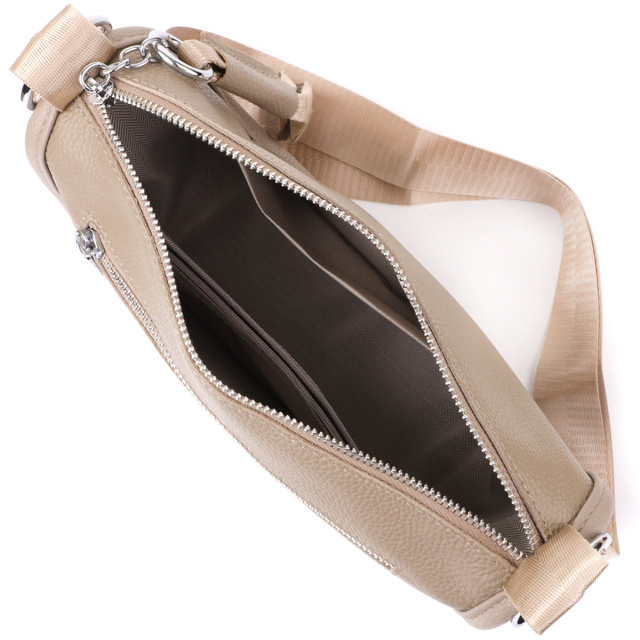 - колір фурнітури під срібло. Жіноча шкіряна сумка у бежевому кольорі виконана з якісної зернистої шкіри та має напівкруглу акуратну форму, яка підкреслює витонченість та сучасний стиль. Особливу увагу привертає декоративний бігунок у вигляді елегантного брелка, що надає моделі індивідуальності та шарму. Сумка закривається на блискавку, всередині розташоване основне відділення із двома кишенями на блискавці та двома відкритими кишенями для дрібних предметів, а на тильній стороні є зовнішня кишеня на блискавці. Незнімний текстильний ремінь забезпечує зручність при носінні, а фурнітура під срібло гармонійно відтінює теплий бежевий колір шкіри. Ця сумка стане стильним та практичним аксесуаром як для повсякденних образів, так і для особливих випадків. ОПЛАТА та ДОСТАВКА : накладний платіж з передоплатою 200 грн.Терміни відправлення : 1-3 робочих днів