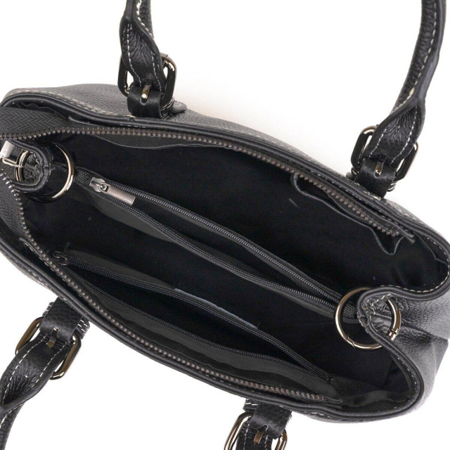 - тонкий регульований текстильний ремінець зі шкіряною вставкою, що знімається. Стильна жіноча сумка з класичним дизайном в чорному кольорі. Сумка буде до душі будь-якій дівчині. За рахунок свого невимушеного дизайну вона підійде під будь-який стиль. Сумочка прошита по краях світлим рядком. Фурнітура в сумці кольору темного срібла. Знизу сумки металеві ніжки, щоб не дряпати низ. Усередині аксесуару якісна текстильна підкладка. Сумка дуже зручно лежить в руці і підійде як під плаття, так і джинси. Модель виконана в шкірі флотар і довго носиться. Ви зможете носити з собою сумку, як на прогулянку, так і на навчання або роботу. Модель має різноманітний функціонал оптимальний під дівчат.