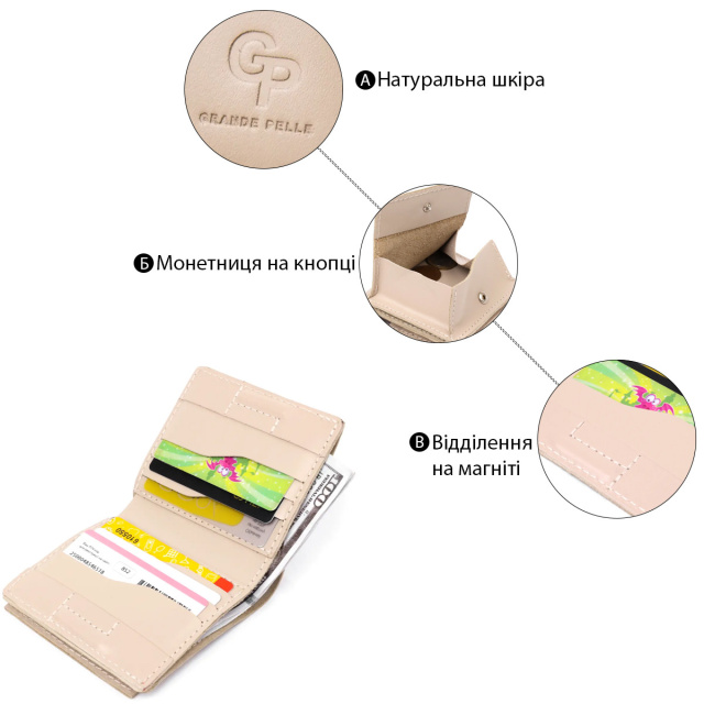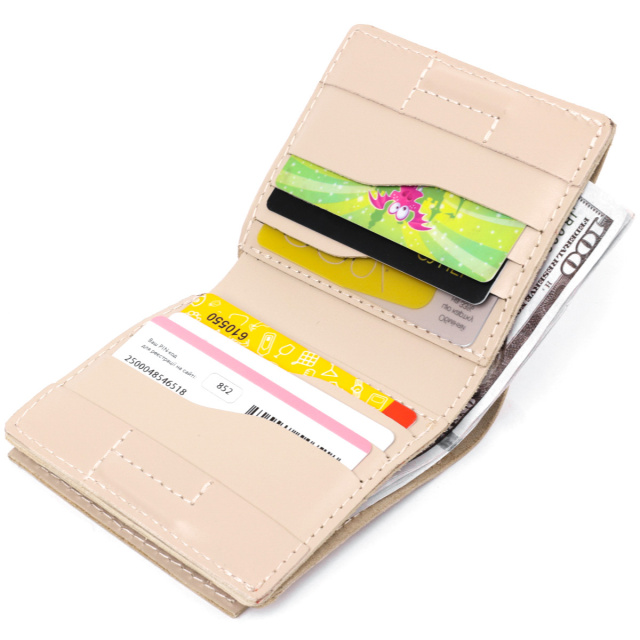 Цікаве жіноче портмоне в бежевому кольорі від українського виробника. Виконано з натуральної шкіри, яка стійка до зносу. Має просторе відділення для купюр, слоти для пластикових карт і оригінальну монетницю на кнопці на зовнішній стороні. Упаковано виріб в фірмову білу картонну коробку. ОПЛАТА та ДОСТАВКА : накладний платіж з передоплатою 200 грн.Терміни відправлення : 1-3 робочих днів