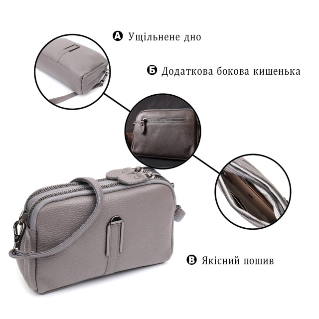 - знімний шкіряний плечовий ремінь. Зручна сумка для жінок невеликого розміру на два автономні відділення з натуральної шкіри флотар, яка невибаглива у догляді та довго носиться. Аксесуар складається з двох автономних відділень, кишені відкритого типу, потайної кишені на блискавці та зовнішньої кишені на блискавці, що знаходиться на тильній стороні. Носити сумку можна в руці, на зап'ясті для цього передбачений шкіряний кистьовий ремінь, що знімається, а також на плечі і через плече, для цього є шкіряний знімний ремінь. В аксесуарі використано якісну фурнітуру кольору срібла. Відмінний варіант сумки для жінок, які люблять якісні та стильні речі. ОПЛАТА та ДОСТАВКА : накладний платіж з передоплатою 200 грн.Терміни відправлення : 1-3 робочих днів