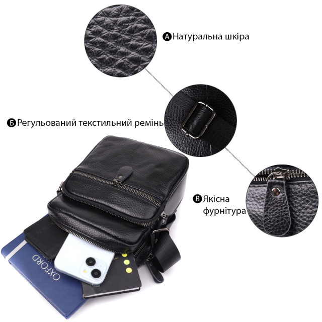 - регульований текстильний ремінець на плече. Чоловіча сумка через плече з натуральної шкіри - зручний та стильний аксесуар для повсякденного використання. Компактна, але містка модель ідеально підійде для міського ритму та ділових зустрічей. Сумка оснащена одним основним відділенням на блискавці. Усередині розташована потайна кишеня на блискавці для зберігання цінних дрібниць. На лицьовій стороні знаходяться дві зручні кишені: накладна кишенька на блискавці і вбудована горизонтальна кишеня на блискавці. Вони забезпечують швидкий доступ до часто використовуваних предметів. На тильній стороні розташована додаткова кишеня на блискавці для документів чи інших речей. Фурнітура срібного кольору підкреслює сучасний та акуратний дизайн. Регульований текстильний ремінець дозволяє носити сумку через плече з максимальним комфортом та адаптацією під індивідуальні уподобання. Відмінний вибір для чоловіків, які цінують практичність та лаконічний стиль. ОПЛАТА та ДОСТАВКА : накладний платіж з передоплатою 200 грн.Терміни відправлення : 1-3 робочих днів