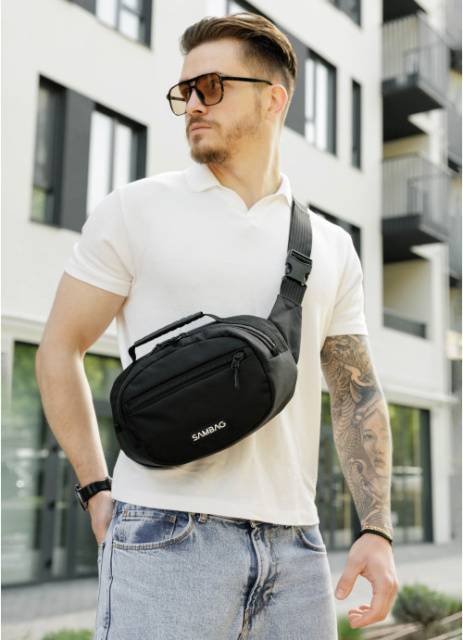 ззовні спереду сумки одна кишеня. Всередині сумки окреме одне основне відділення, кишеня на блискавці, відкрита кишеня та кишеня з сітки. Додатково має карабін для ключів. Ззовні на спинці сумки одна кишеня на блискавці. Спинка - вентиляційна, виконана з Air Mesh 3D. Стандартно поставляється на обхват по талії (через плече) від 86 см до 160 см: ремінь регулюється. При замовленні в коментарі зазначте необхідну довжину ременя, якщо вона відрізняється від стандартної.
