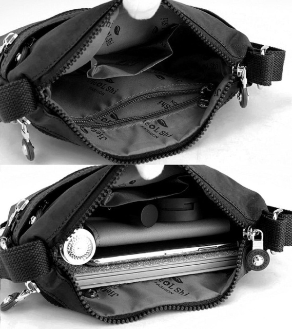 Сумка жіноча 75058A пошита з міцної чорної тканини з вологовідштовхувальними властивостями.