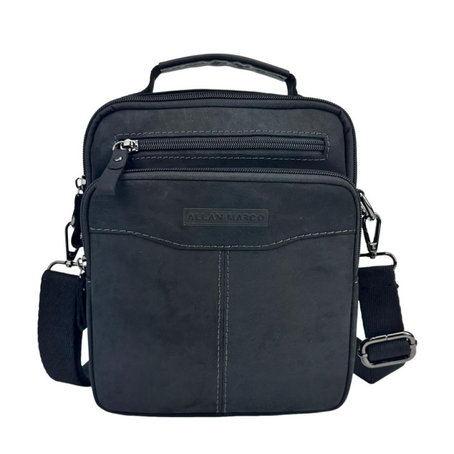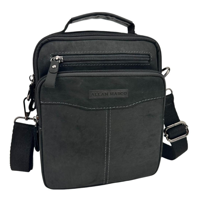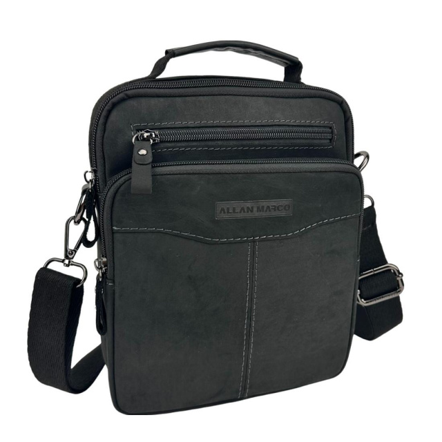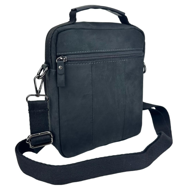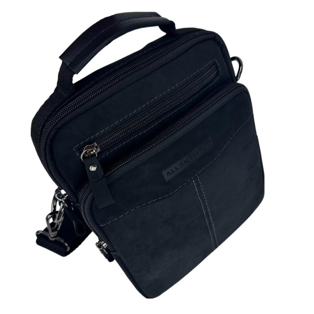 Чоловіча шкіряна чорна сумка месенджер з ручкою зі шкіри нубук
