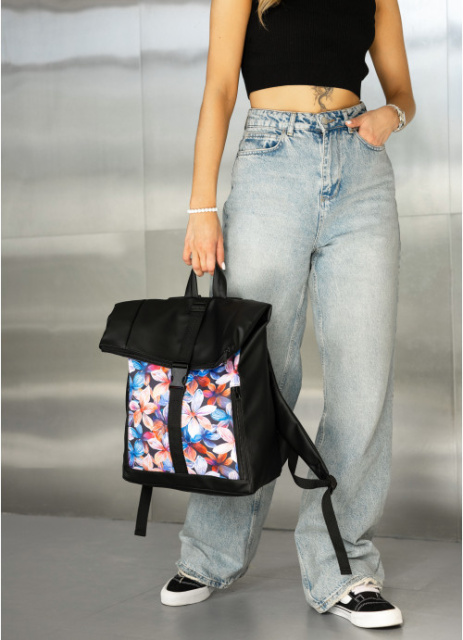Чорний жіночий рюкзак чорний з квітковим принтом