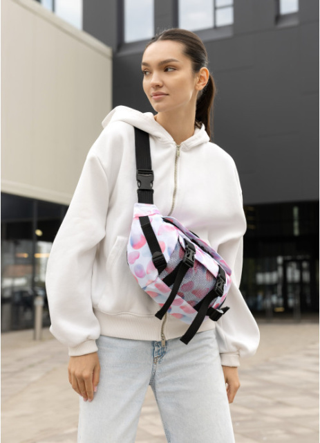 ззовні спереду сумки кишеня з сітки. Всередині сумки, окрім основного відділення, є дві відкриті кишені, одна велика кишеня на блискавці, в якій три відкритих відділення. Ззовні на спинці сумки дві відкриті кишені, куди легко поміститься телефон та інші дрібниці. Стандартний обхват (сумка з ременем) становить від 86 см до 168 см (довжина регулюється). При замовленні в коментарі зазначте необхідну довжину ременя, якщо вона відрізняється від стандартної.