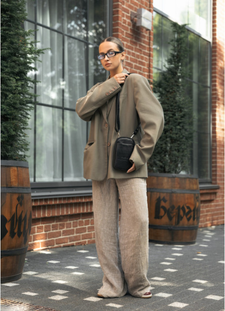 на зовнішньому боці сумки розташована відкрита кишеня, поділена на кілька відділень. Усередині сумки — просторе основне відділення та додаткова відкрита кишеня для дрібних речей. Ззовні на спинці сумки одна кишеня на блискавці. Довжина ременя регулюється до 146 см.